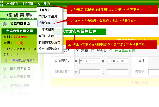 眉州人才網(wǎng)(WWW.RC139.COM),發(fā)布招聘信息,需先登錄進(jìn)系統(tǒng),然后按下圖操作。